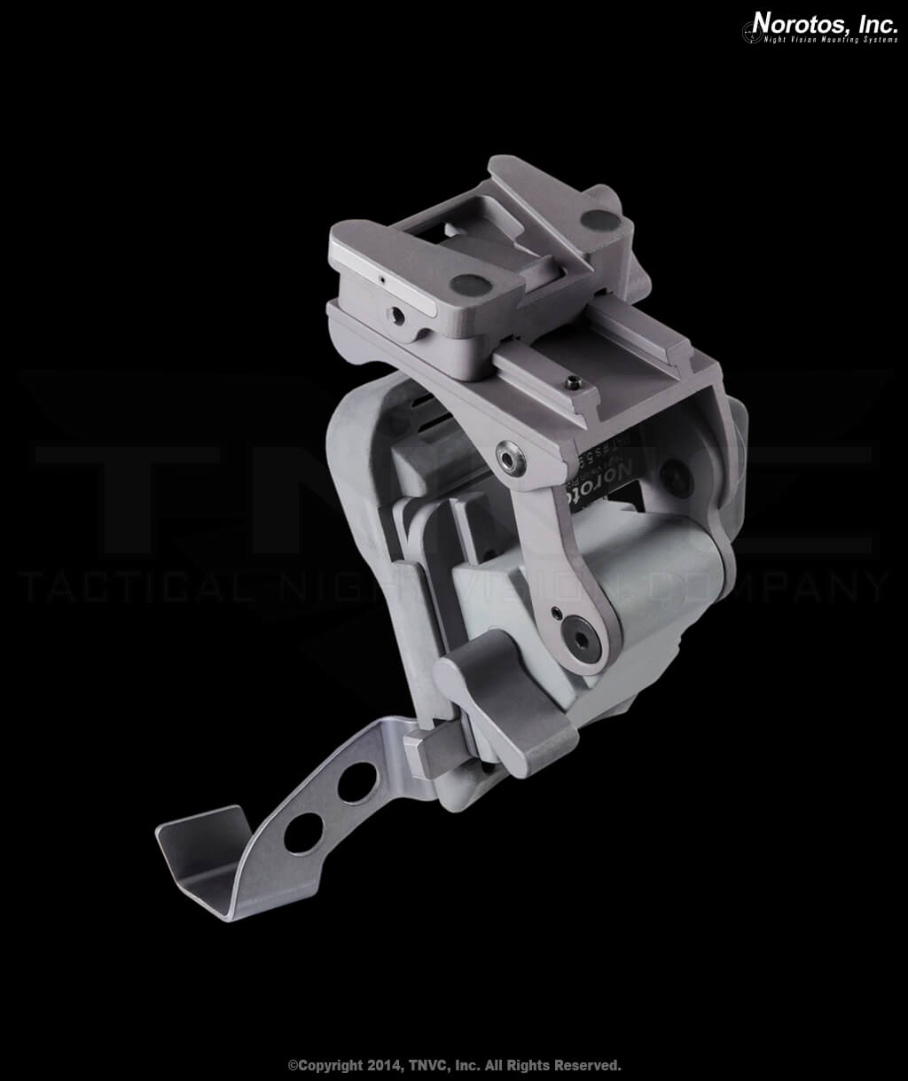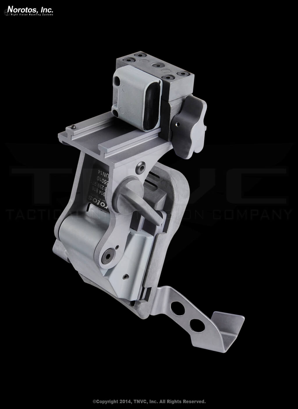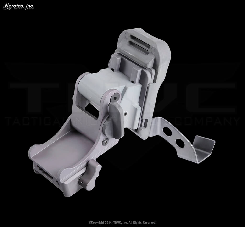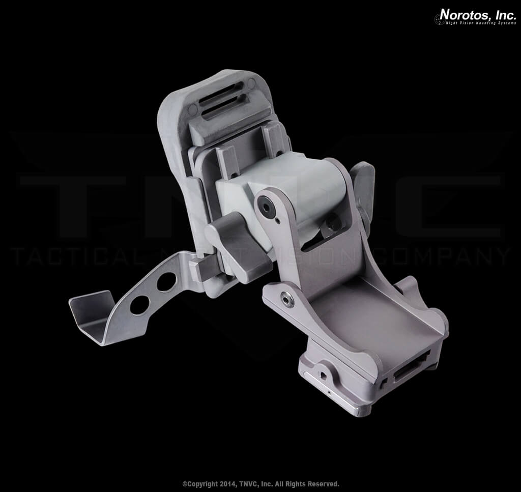 The attachment style “BAYONET” RHNO II is designed with a Bayonet/Horn interface. It will work with night vision goggles such as the NGI/PVS-7 ComSpec, NGI/PVS-7 PLUS, NGI/PVS-14 ComSpec, NGI/PVS-14 PLUS, AN/PVS-7B(D), AN/PVS-14. The attachment style “DOVETAIL” RHNO II is designed with a dovetail interface. It will work with night vision goggles such as the NGI/SENTINEL ComSpec, NGI/SENTINEL PLUS , PVS-18, AN/PVS-15, AN/PVS-18, AN/PVS-31, and BNVD-G. For over 25 years, the USGI “Rhino Mount” has served as the standard issue night vision goggle mount for the U.S. Military and her Allies. It was attached to PASGT, MICH/ACH, and every other helmet in the U.S. Arsenal. When the Department of Defense solicited a new night vision helmet mount, Norotos answered with the RHNO II. Featuring solid advancements over its predecessor, the RHNO II brings a new level versatility and performance to warfighters’ night vision abilities. The RHNO II comes complete with a shroud and mount. The shroud is designed to fit standard one-hole helmets as used by the U.S. Army. It accepts all standard bracket-style mounts. A wide set of legs securely clamp under the lip of the helmet, helping to keep it from rotating. The Mount features three points of adjustment: vertical, fore/aft, and tilt. Unlike the previous USGI mount, the RHNO II features 1″ of vertical adjustment. This is a welcome addition since many users had a hard time adjusting the legacy mount to fit their head, causing them to adjust the way the helmet rode on their heads. Additionally, a full 1.60″ fore/aft adjustment allows the attached night vision goggle to sit at the correct distance from the eye(s). 17º of tilt adjustment finish off the adjustment options. All moving parts are locked into place via levers that control their travel on straight rails. This provides the user with “infinite” adjustments rather than relying “teeth” to set movement at certain points. The RHNO II utilizes the tried and true “force to overcome” method of stowing the goggle when it is not in use. To stow the goggle, simply grasp it and rotate it up. The opposite is done to bring the goggle back down in front of the user’s face. NVG’s that utilize the auto-off feature are compatible with the RHNO II.