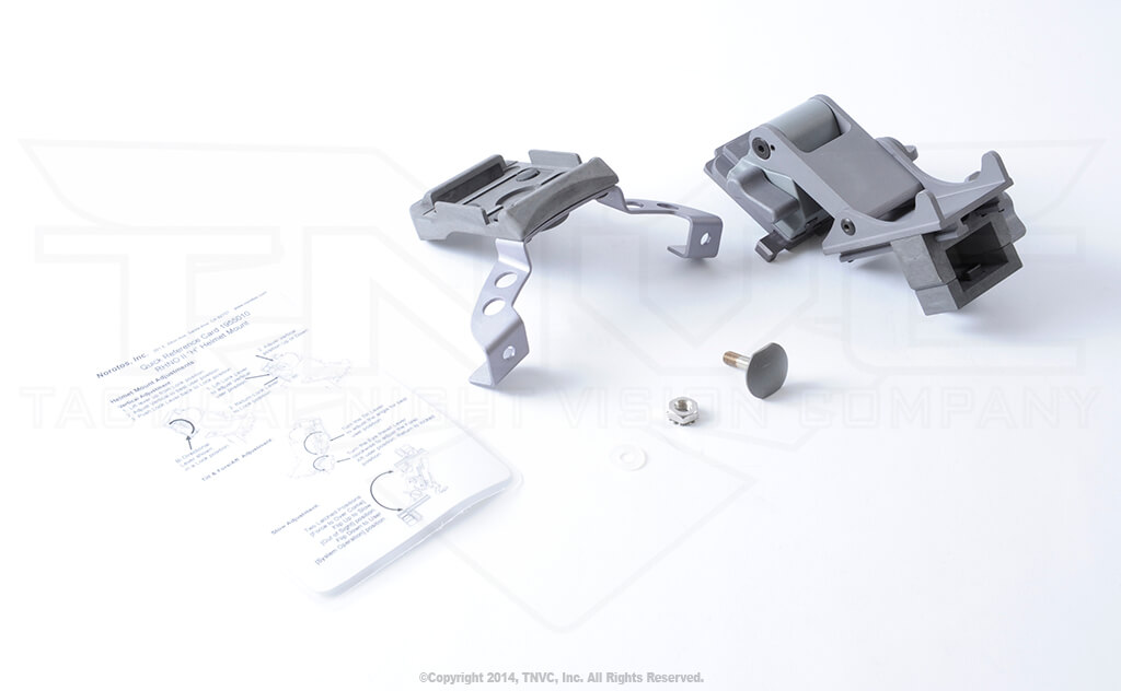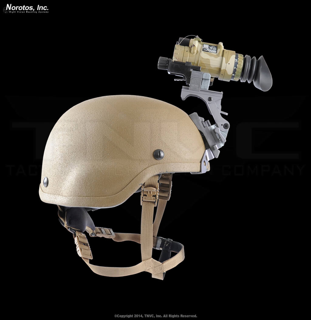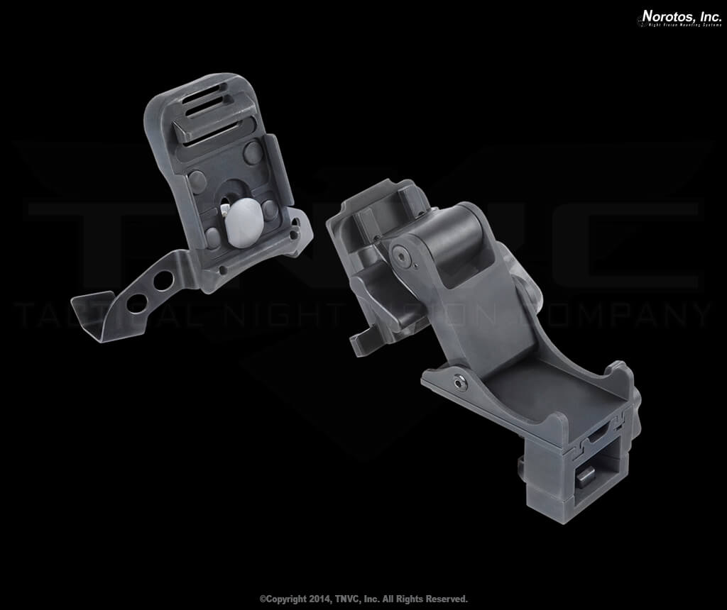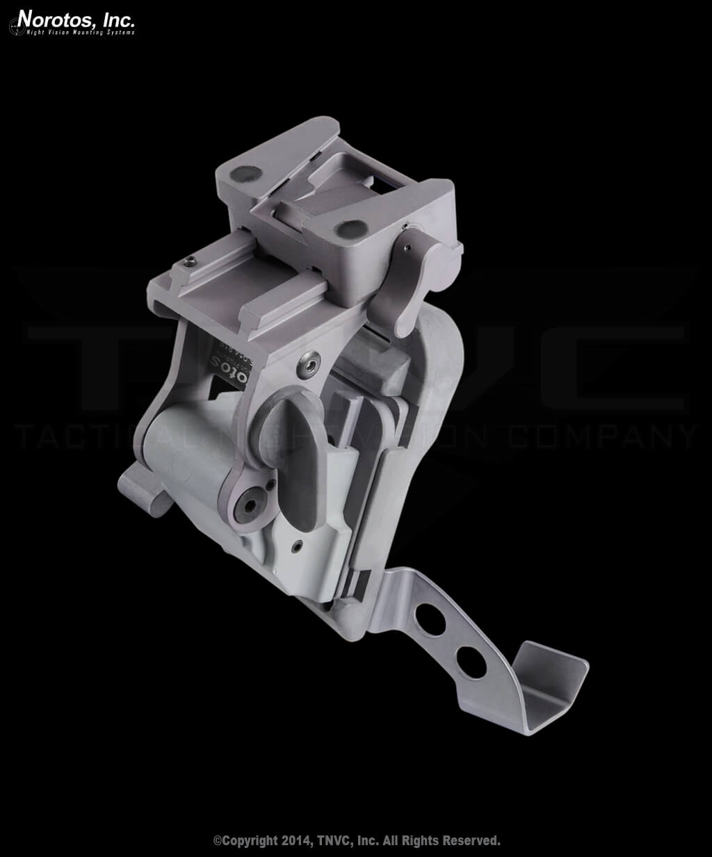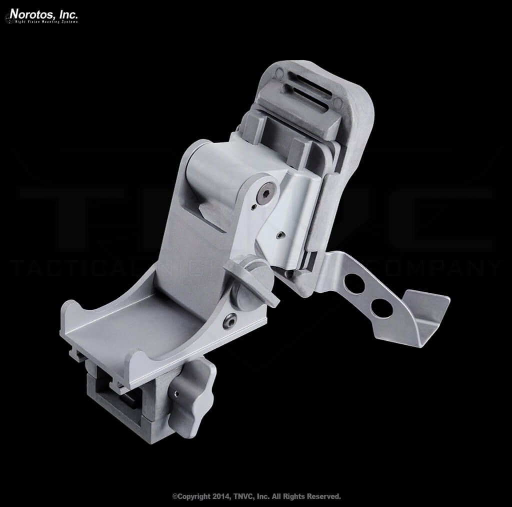 The attachment style “BAYONET” RHNO II is designed with a Bayonet/Horn interface. It will work with night vision goggles such as the NGI/PVS-7 ComSpec, NGI/PVS-7 PLUS, NGI/PVS-14 ComSpec, NGI/PVS-14 PLUS, AN/PVS-7B(D), AN/PVS-14. The attachment style “DOVETAIL” RHNO II is designed with a dovetail interface. It will work with night vision goggles such as the NGI/SENTINEL ComSpec, NGI/SENTINEL PLUS , PVS-18, AN/PVS-15, AN/PVS-18, AN/PVS-31, and BNVD-G. For over 25 years, the USGI “Rhino Mount” has served as the standard issue night vision goggle mount for the U.S. Military and her Allies. It was attached to PASGT, MICH/ACH, and every other helmet in the U.S. Arsenal. When the Department of Defense solicited a new night vision helmet mount, Norotos answered with the RHNO II. Featuring solid advancements over its predecessor, the RHNO II brings a new level versatility and performance to warfighters’ night vision abilities. The RHNO II comes complete with a shroud and mount. The shroud is designed to fit standard one-hole helmets as used by the U.S. Army. It accepts all standard bracket-style mounts. A wide set of legs securely clamp under the lip of the helmet, helping to keep it from rotating. The Mount features three points of adjustment: vertical, fore/aft, and tilt. Unlike the previous USGI mount, the RHNO II features 1″ of vertical adjustment. This is a welcome addition since many users had a hard time adjusting the legacy mount to fit their head, causing them to adjust the way the helmet rode on their heads. Additionally, a full 1.60″ fore/aft adjustment allows the attached night vision goggle to sit at the correct distance from the eye(s). 17º of tilt adjustment finish off the adjustment options. All moving parts are locked into place via levers that control their travel on straight rails. This provides the user with “infinite” adjustments rather than relying “teeth” to set movement at certain points. The RHNO II utilizes the tried and true “force to overcome” method of stowing the goggle when it is not in use. To stow the goggle, simply grasp it and rotate it up. The opposite is done to bring the goggle back down in front of the user’s face. NVG’s that utilize the auto-off feature are compatible with the RHNO II.